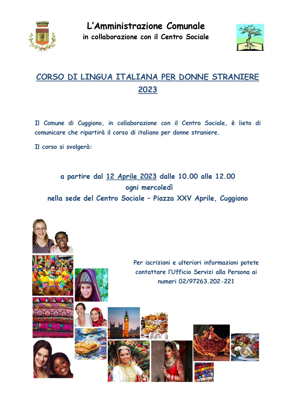 L’Amministrazione comunale è lieta di comunicare che da mercoledì 12 Aprile 2023 ripartirà il corso di italiano per donne straniere, organizzato grazie alla collaborazione dei volontari del Centro Sociale di Villa Annoni.