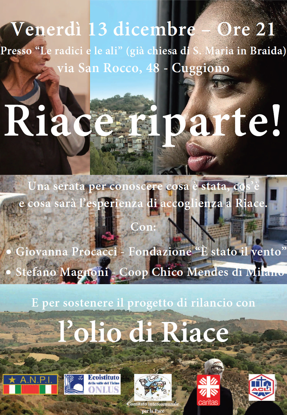 Una serata con Giovanna Procacci, della Fondazione È Stato il vento, e Stefano Magnoni della Cooperativa Chico Mendes, “per conoscere cosa è stata, cosa è, e cosa sarà, l’esperienza di accoglienza a Riace, e per sostenerne il progetto di rilancio con l’olio di Riace”.