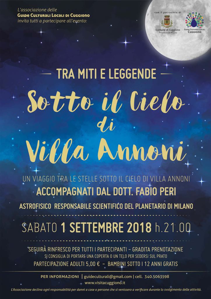 Villa Annoni Piazza XXV Aprile, 4, Cuggiono, Milano, ItaliaSabato 1 settembre vi aspettiamo per un’indimenticabile serata sotto le stelle. Viaggio tra le stelle sotto il cielo di Villa Annoni accompagnati dal Dott. Fabio Peri astrofisico, responsabile scientifico del Planetario di Milano. Seguirà rinfresco per tutti i partecipanti. Gradita prenotazione. Si consiglia di portare una coperta o un telo per sedersi sul prato. Partecipazione adulti 5 euro, […]