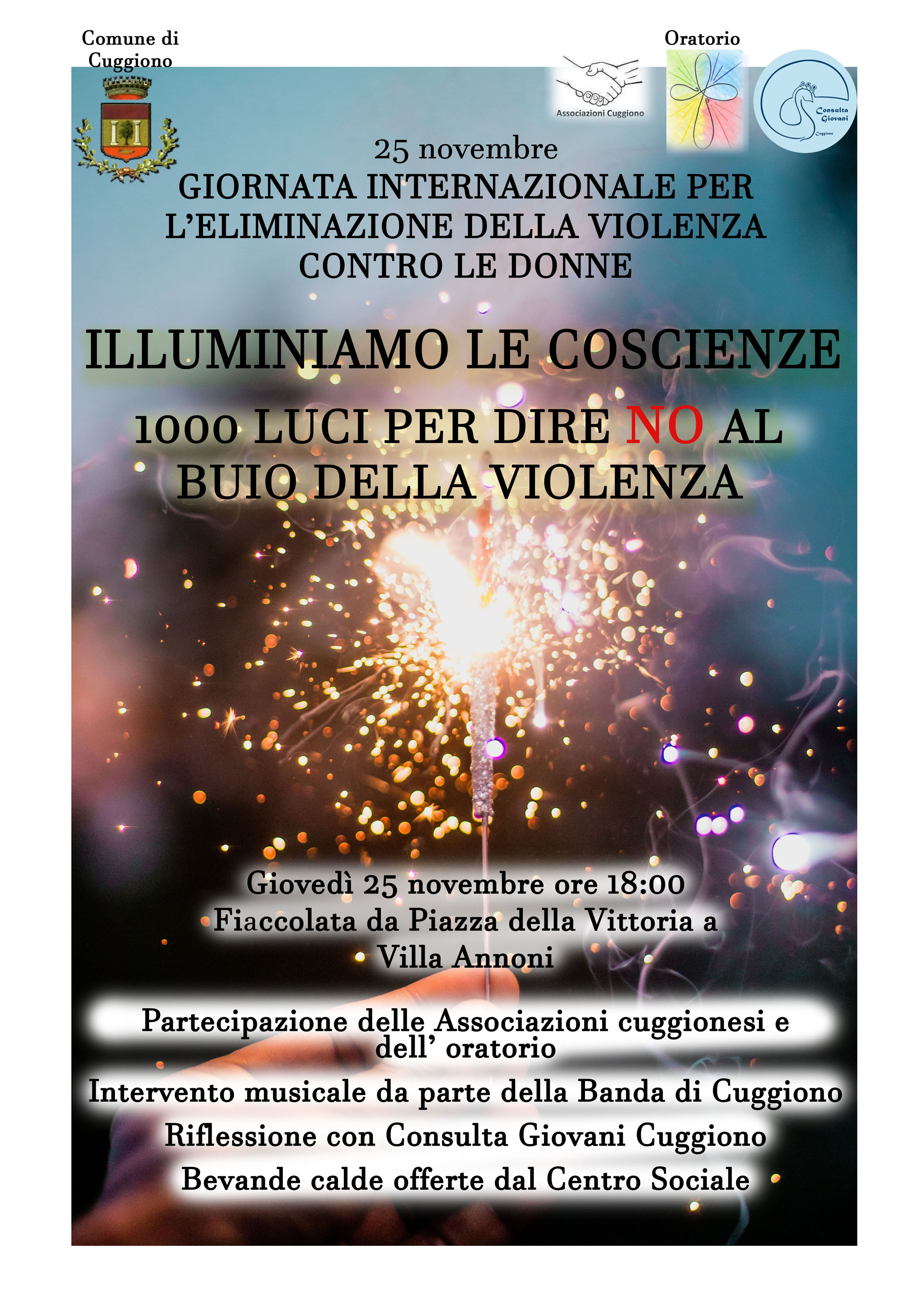 Si comunica che la fiaccolata contro la violenza sulle donne prevista per giovedì 25/11 alle ore 18.00 è rimandata causa meteo avverso a mercoledì 1° dicembre alle ore 18.00.