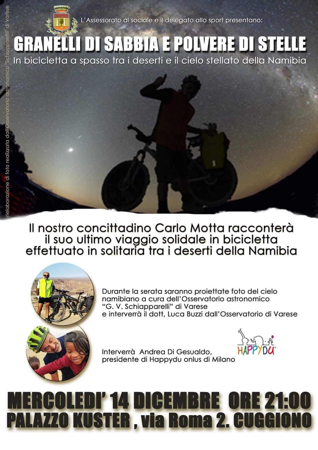 Il concittadino Carlo Motta racconterà il suo ultimo viaggio solidale in bicicletta effettuato in solitaria tra i deserti della Namibia.