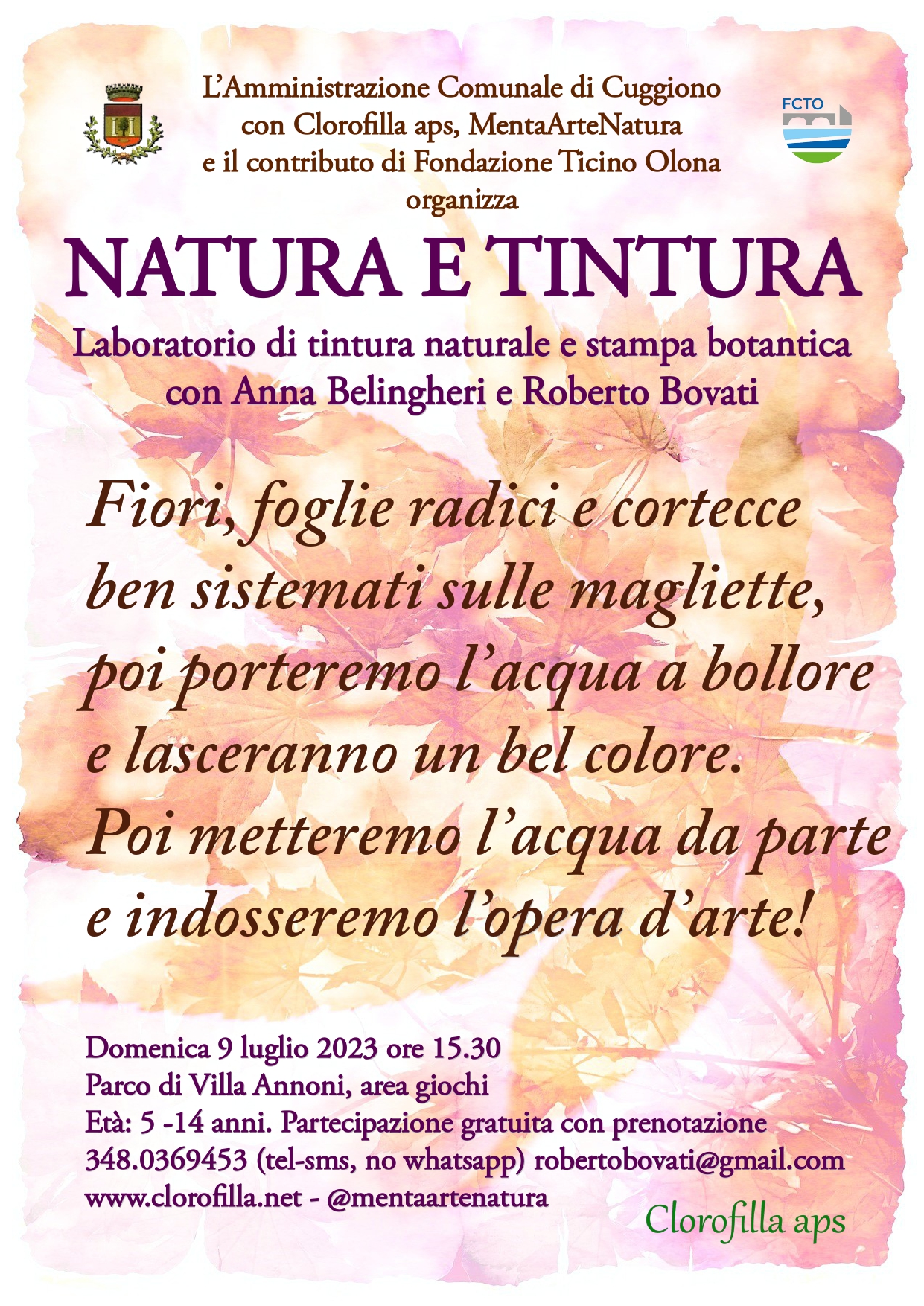 Si comunica che domenica 9 luglio alle ore 15.30 presso il parco di Villa Annoni – portico adiacente all’area giochi – si svolgerà il laboratorio per bambini “Natura e Tintura”, rivolto a bambini e ragazzi dai 5 ai 14 anni. In allegato le informazioni specifiche sull’iniziativa e le modalità di prenotazione