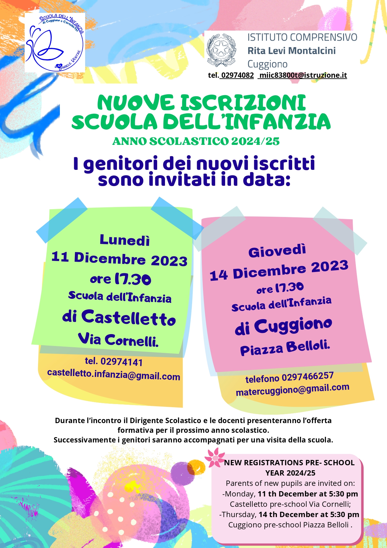 La Scuola dell’Infanzia e l’Istituto Comprensivo Rita Levi Montalcini invitano i genitori dei nuovi iscritti per presentare l’offerta formativa per il prossimo anno scolastico e per visitare gli spazi della scuola.