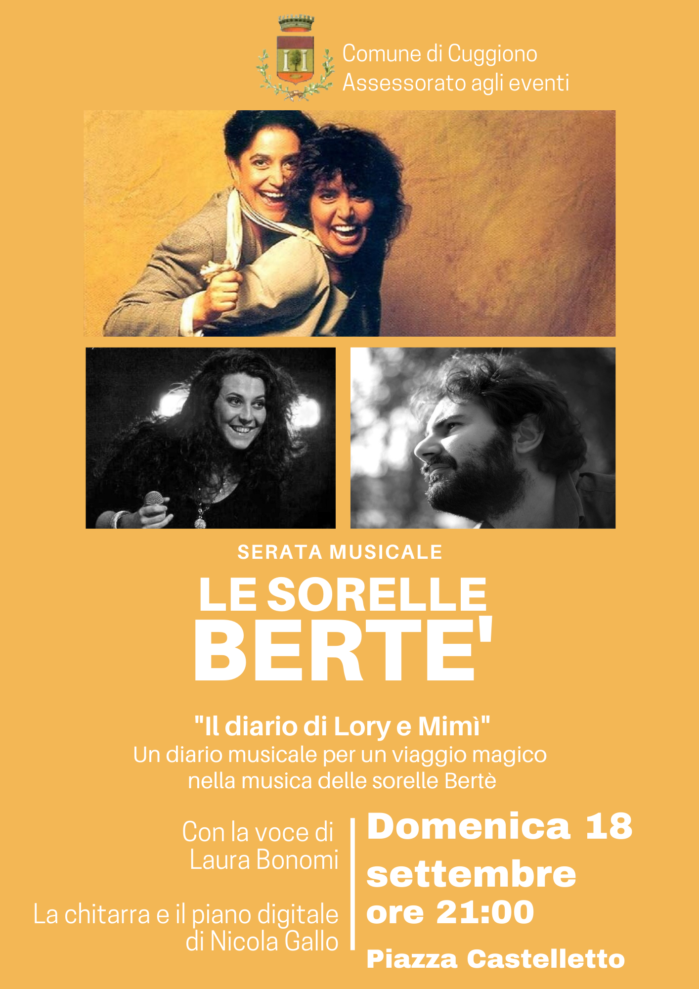 L’Amministrazione invita tutti i cittadini a partecipare alla serata musicale “Le sorelle Bertè – Il diario di Lory e Mimì” nella serata di domenica 18 settembre alle ore 21.00 in piazza Castelletto.